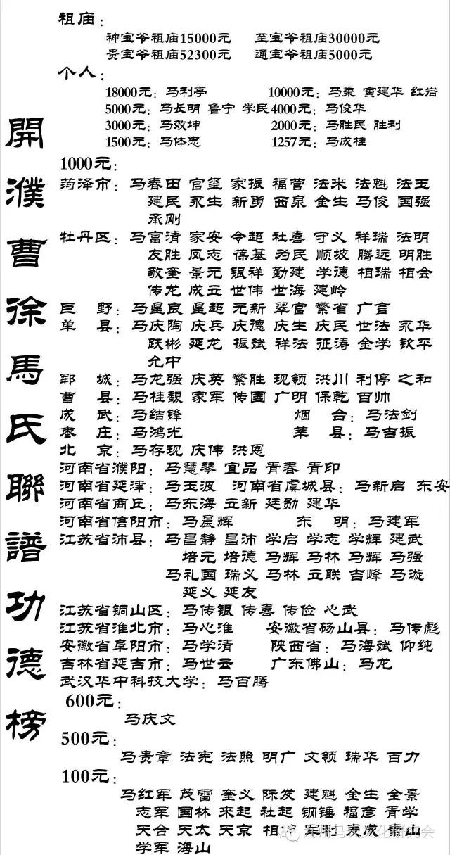 2011年2月,倡議剛一公開,便得到了馬憲領、馬紅軍、馬福清、馬春言、馬立舉等5位家族長及全體祖廟理事會的鼎力支持。在聯譜最困難時期,在北京工作的,恕不相識的濮陽宗親馬慶偉第一個捐款500元,後又捐款500元。東明石化原書記、董事長,菏澤德泰化工董事長,東明人馬利亭、馬紅岩父子捐款3萬多元接待、招待宗親,並自費出資讓宗親會去陝西扶風、山西洪洞縣大槐樹考察我們家族淵源。陝西省銅川市政法委書記、曹縣宗親馬秉銀,東莞市旭源化工董事長、東明人馬建華等慷慨解囊、主動分別捐款10000元。單縣黃崗鎮高莊宗親、70多歲的宗親馬慶文在自己捐款600元的同時,又動員本村12名宗親分別捐款1000元。東明縣武勝橋後張樓宗親、農民工馬建軍,在去天津打工途中,在菏澤乘車間隙,主動捐款1000元。嘉祥縣東紙坊鎮宗親馬文領為三門家廟捐助牌坊一個,價值8萬多元。所有這些人是我們家族的楷模,值得我們尊重。