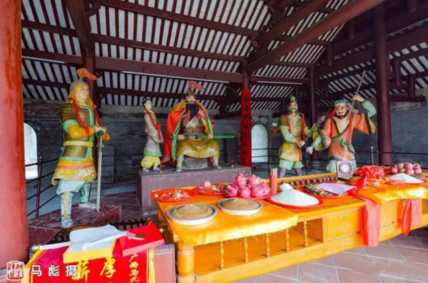 接下來便是祭拜伏波將軍儀式,宗親在廟前列隊。鼓樂響起,由司儀帶隊入廟。入廟後,司儀在前,祭祀牲品抬到伏波將軍塑像前,各位宗親在祭壇亭下列隊。