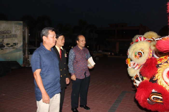 双狮迎宾,左一为拿督马汉坤,中间为马国强,最右为马鸿斌。