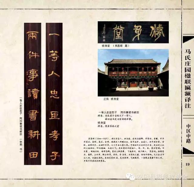 家人卦》象征家庭:特别注重女人在家中的作用,女子要坚守正道,始终如一,将会非常有利。“家道正而天下定”,与儒家“修身、齐家、治国、平天下”的思想相统一。家人卦比喻先治家而后治天下,家道正,天下安乐。《象》曰:风自火出,家人;君子以言有物而行有恒。君子要言之有物,言之有理,言之有礼,知行合一,不能侃侃而谈,做事不能虎头蛇尾。庄园主人马丕瑶借用“文王拘而演周易、仲尼厄而著春秋”,先贤圣人不畏困境、锲而不舍的精神,激励、鼓舞马氏族人,学习先贤“言有物行恒”的精神。如马家匾额“刚健笃实”,楹联“一敬胜百邪,一诚包万有”,无不体现出这种精神。在物质条件日渐优越的今天,我们更应该学习圣人“言有物行有恒”,孜孜不倦、持之以恒的精神,而获得人生的成功!